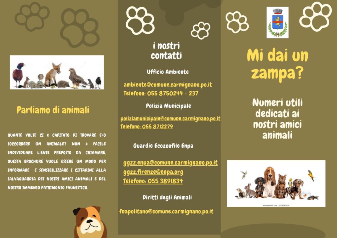 CARMIGNANO – Una brochure “per i nostri amici animali”. Numeri utili per la salute e la cura di compagni fidati: è quella curata da Francesca Napolitano, consigliera speciale del sindaco Edoardo Prestanti per le questioni legate al benessere degli animali. “Quante volte ci è capitato di trovare e/o soccorre un animale?”, recita così la terza di copertina della brochure a due facce ideata da Napolitano ed edita dal Comune, che parte dal presupposto che “non è facile individuare l’ente preposto da chiamare”. La brochure intende, infatti, essere “un modo per informare e sensibilizzare i cittadini alla salvaguardia dei nostri amici animali e del nostro immenso patrimonio faunistico”, in un territorio dove forte è la loro presenza. I numeri utili, con relative e-mail, compresa quella di Napolitano (fnapolitano@comune.carmignano.po.it), sono, per il Comune, quelli dell’ufficio Ambiente (ambiente@comune.carmignano.po.it; 055 8750244-237) e della Polizia municipale (poliziamunicipale@comune.carmignano.po.it, 055 8712279), ma sono anche quelli delle Guardie edcozoofile Enpa (ggzz.enpa@comune.carmignano,po.it; ggzz.firenze@enpa.org; 055 3891834).