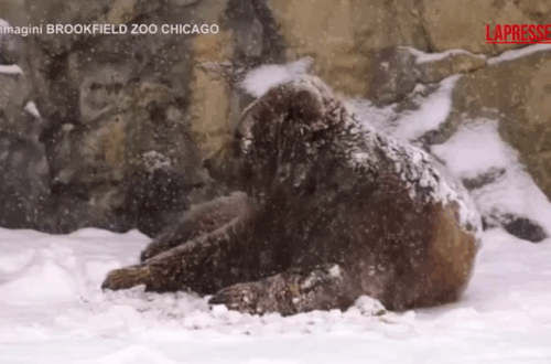 Usa, l’orso bruno Tim si rotola nella neve allo zoo di Chicago