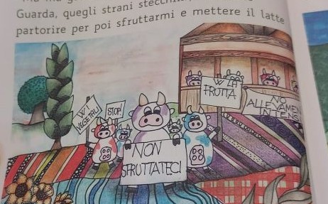 Nei disegni del Diario le mucche mostrano cartelli con le scritte “Non sfruttateci” e “No allevamenti intensivi”. “Mi fanno partorire per poi sfruttarmi e mettere il latte in vendita” dice una mucca intervistata da un gatto. Poi c’è l’invito a “bere più latte vegetale”. Tutte affermazioni coerenti con la realtà e appelli perfettamente comprensibili mettendosi nei panni di un animale, ma questo ha causato il risentimento degli allevatori, che minacciano di rivolgersi persino al Ministro dell’Istruzione e del Merito per chiedere la distruzione di tutte le copie, sostenendo che il Diario sarebbe “pura disinformazione, ed evidente gravissima accusa infamante” nei confronti degli allevatori stessi.