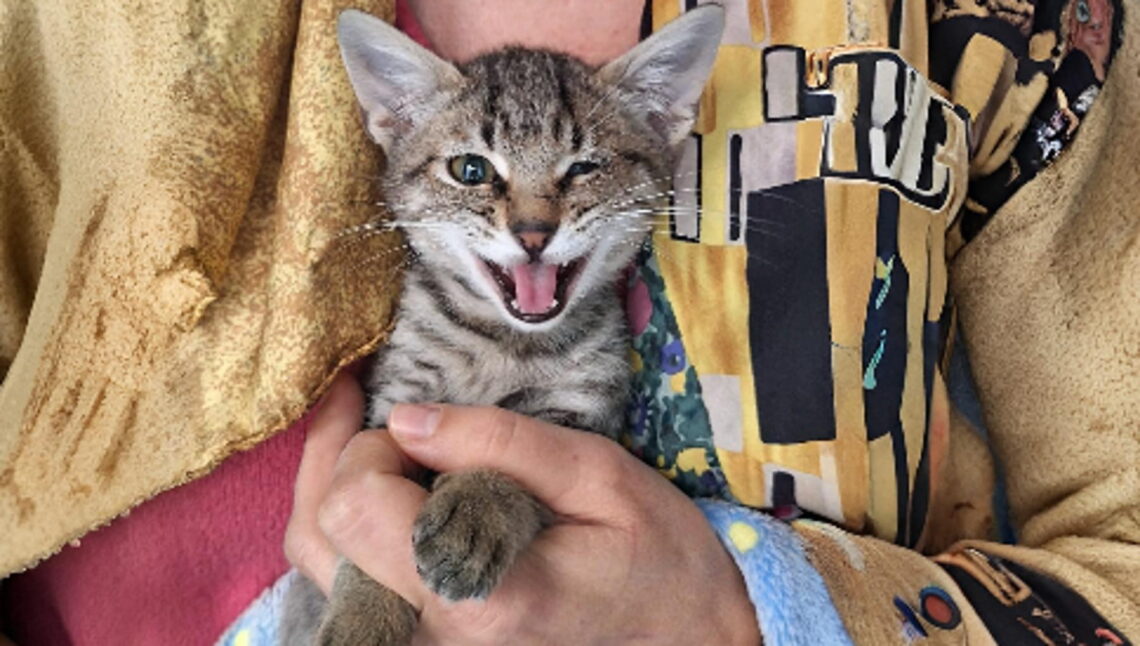 Era un sabato di pioggia, ci raccontano, e lui, minuscolo, tra una macchina e l’altra che gli sfrecciavano vicinissime, tentava di resistere. Tutti lo vedevano, impossibile non notarlo, ma nessuno si fermava o rallentava, nonostante fosse evidente che il micio avesse delle difficoltà. Le volontarie si sono precipitate sul posto e hanno recuperato quel fagottino di appena due mesi, che arrancava con un occhio completamente di fuori. Una volta portato in clinica, i veterinari hanno diagnosticato una rinotracheite, tipica tra i cuccioli in stato di abbandono, che gli aveva provocato la lesione all’occhio sinistro, ormai perso. Ciò che non è mai stata persa, invece, è la speranza di trovargli ugualmente una casa, nonostante il suo piccolo difetto di fabbrica. A questo ci pensiamo noi de La Zampa, che tendiamo pennacchi e calamai a tutte le zampe di cui i volontari ci raccontano.