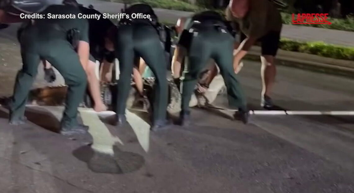 Quante persone ci vogliono per sollevare un alligatore di 14 metri e 450 kg, toglierlo dalla strada e metterlo al sicuro riportando la tranquillità nel vicinato? Se lo chiedono a Sarasota, in Florida, dove l’enorme animale è stato avvistato per strada, tra le case. Sul posto sono intervenuti gli agenti della contea di Sarasota che hanno diffuso anche un video e delle foto che mostrano le difficili operazioni di recupero dell’alligatore. Ad aiutare i poliziotti è stato anche un cacciatore esperto. L’animale è stato sistemato sul retro di un grosso pick-up, e trasferito in una fattoria specializzata che già ospita questa tipologia di grossi rettili. (LaPresse)